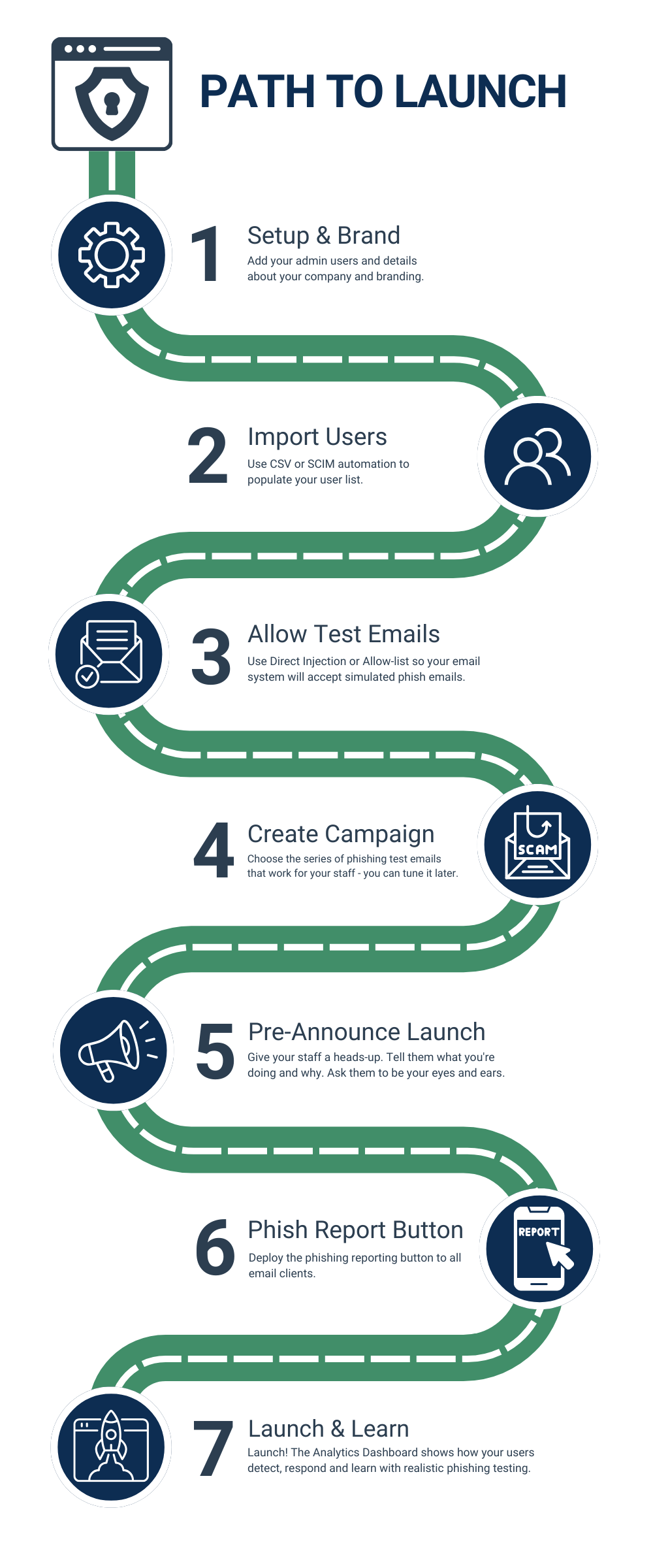 SoSafe provides an interactive preflight and launch checklist – built right in to your SoSafe admin portal. CyberSmart Technologies follows this ‘path to launch’. If we hit any speed bumps, we can quickly adjust course and get your campaign launched on time.