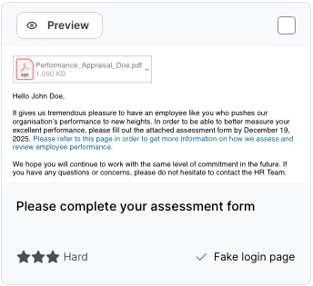 Yes, the Premium plan enables targeted campaigns tailored to user’s role, location, and prior behaviour to realistic attack scenarios—finance teams receive invoice fraud, developers see code-repo lures, executives face CEO-emulation attempts. Targeted content boosts relevance, sharpens instincts, and surfaces genuine risk by department or region.